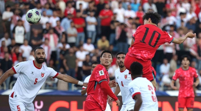 국제축구연맹(FIFA) 랭킹 23위 한국은 이날 전까지 승점(4)은 같지만 다득점(3점)에서 요르단(4점)에 밀려 조 2위를 달렸다. 주장 손흥민이 햄스트링(허벅지 뒤 근육) 부상으로 합류하지 못한 가운데 이날 주장 완장은 김민재가 찼다. 손흥민이 주로 뛰어온 왼쪽 공격수 자리는 황희찬이 맡았다.  이재성(10번)이 2026 북중미 월드컵 아시아 3차예선 B조 요르단과의 경기 전반 38분 헤딩을 시도하고 있다. 이 슈팅이 골망을 흔들며 이재성은 결승 선제골을 기록했다. 한국이 2-0으로 승리했다. 암만=뉴시스
