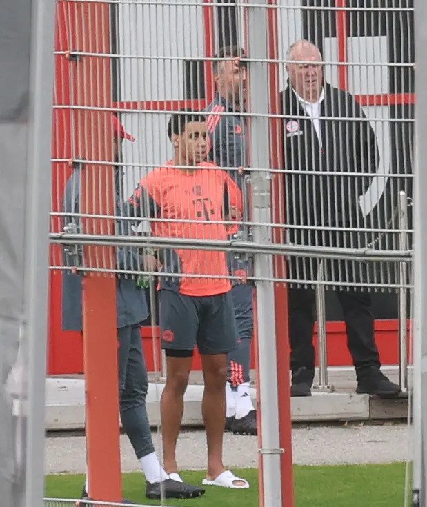 무시알라가 목발 없이 슬리퍼 차림으로 팀 훈련을 지켜봤어요. 베르더 브레멘전 앞두고 콤파니 감독과 5분간 대화하며 밝은 분위기!